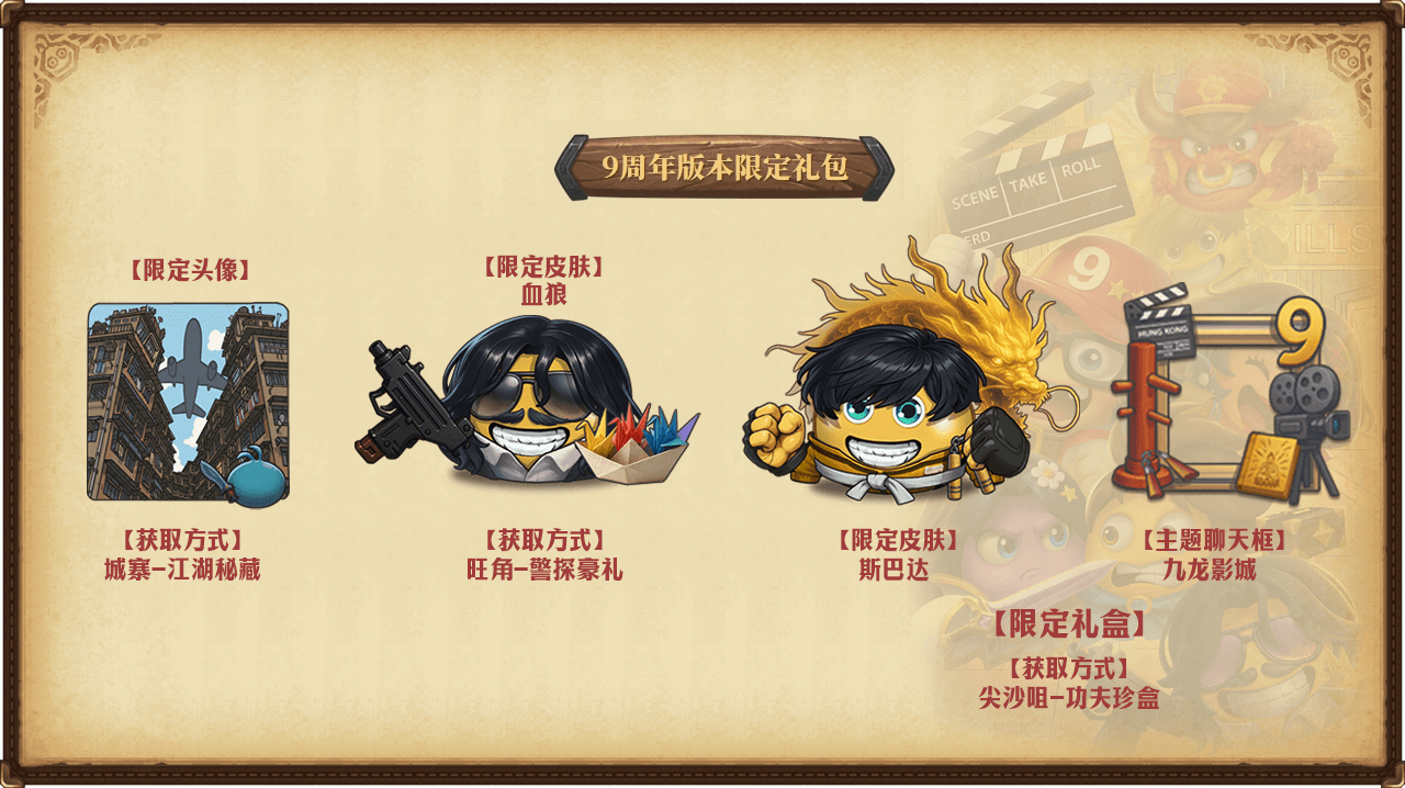 九周年限定礼包来袭!包含限定头像、皮肤和聊天框等物品,可以根据下图获取方式逐一收入囊中!
